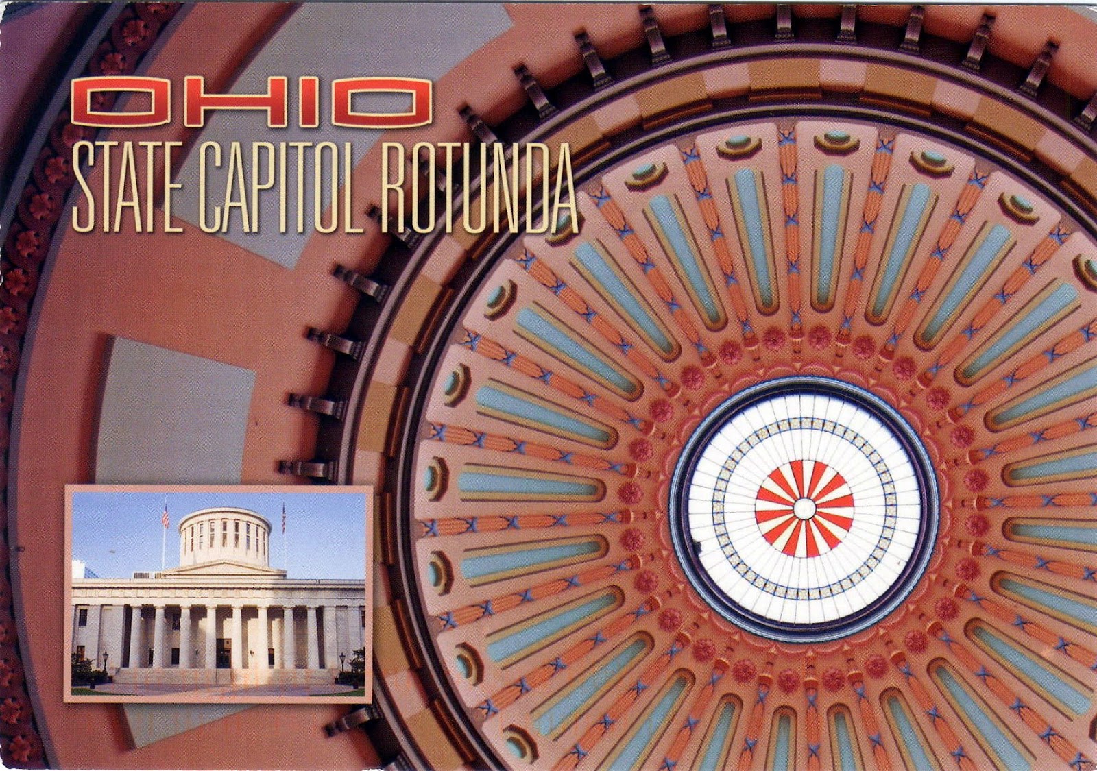 Today, we are going to Columbus, Ohio in USA. Columbus is the capital of Ohio State. The card shows the Capitol Rotunda. The rotunda is one of the most remarkable spaces in the Statehouse. The rotunda stretches 120 feet from the floor to the skylight, and its' crown jewel is the dome's 29 foot wide skylight.